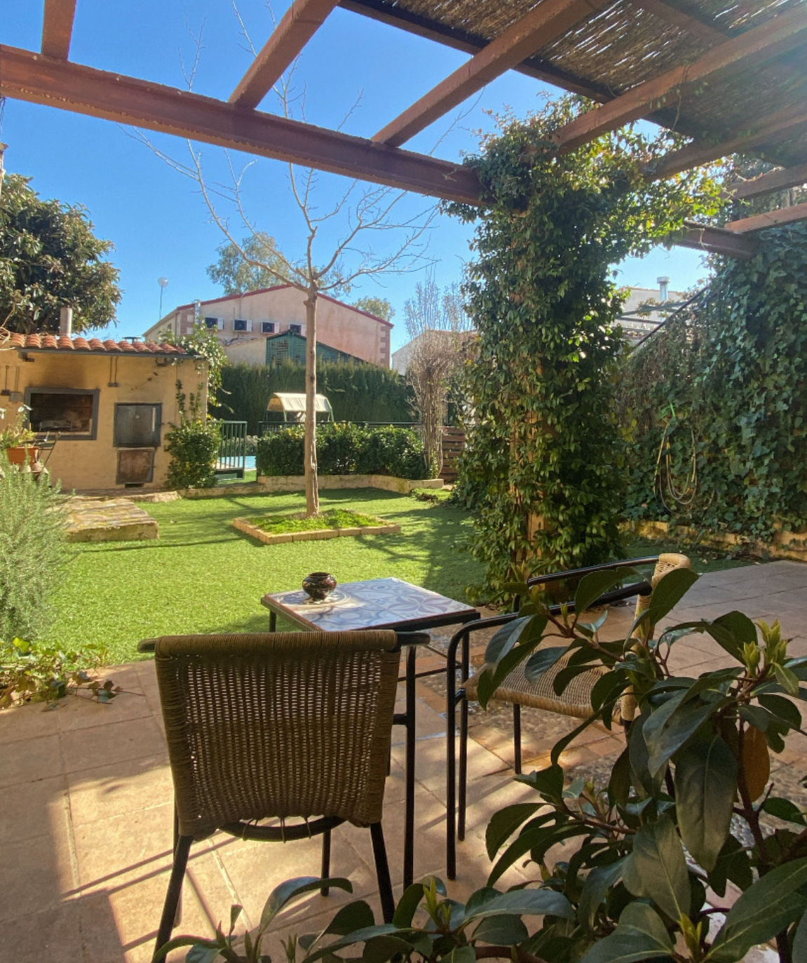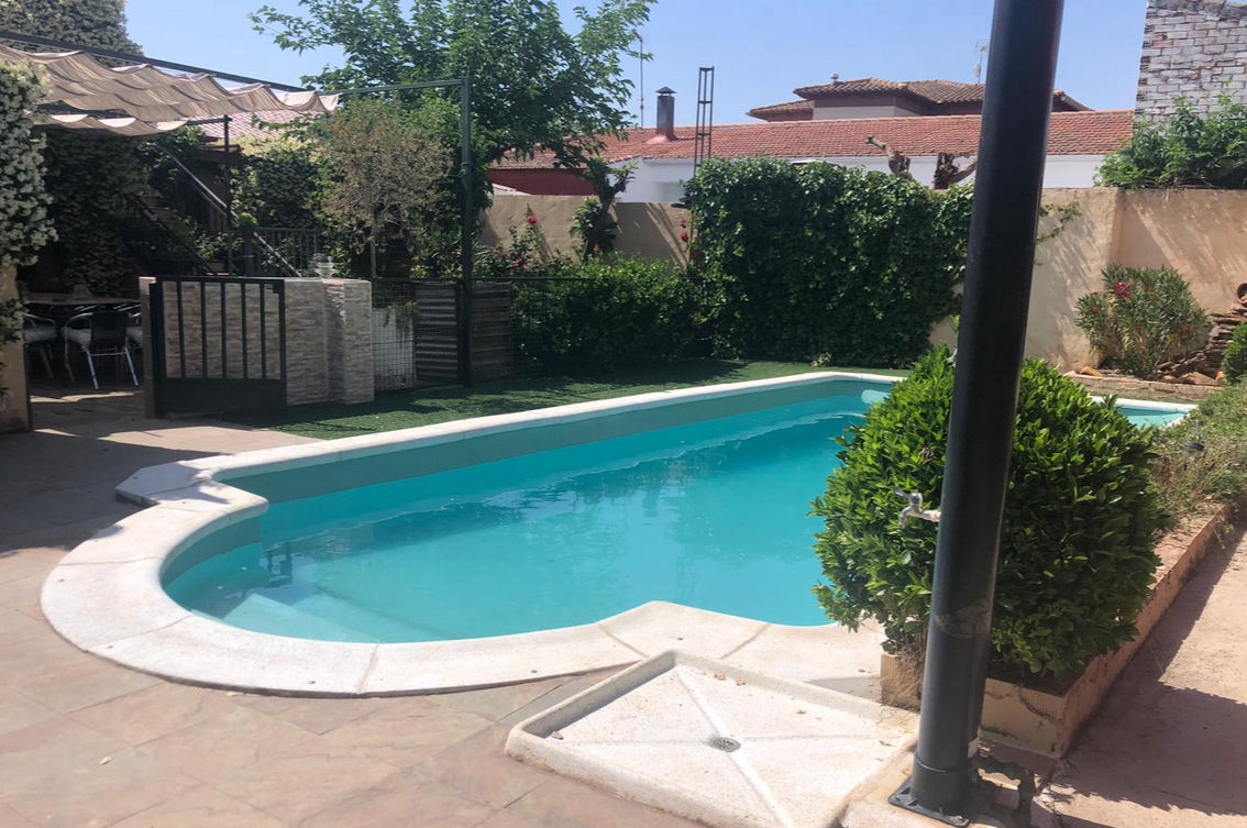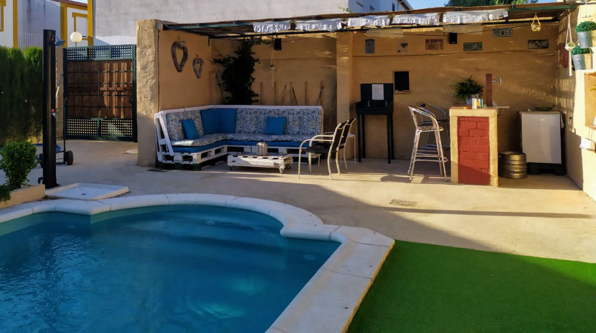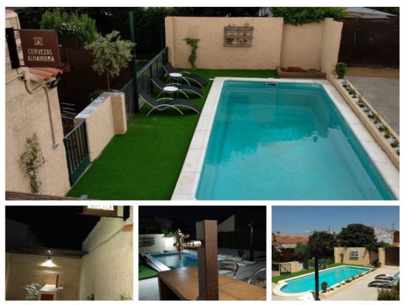 Patio exterior de 500 m2, con cenador, piscina, barbacoa, horno de leña, porche de juegos (futbolín diana electrónica, juego de la rana, juegos de mesas….). Zona de Chill-out con barra y grifo de cerveza